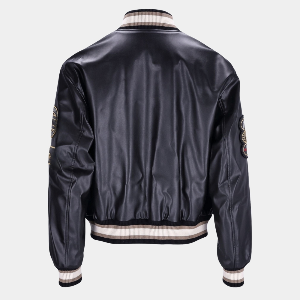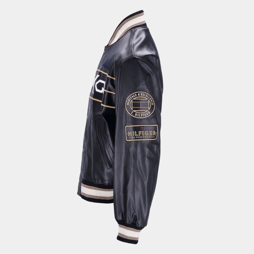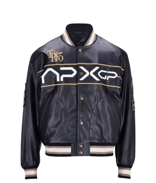 Worn by Idris both on screen and in promotional campaigns, the jacket is crafted from black vegan leather, emphasizing a modern approach to luxury outerwear. Its design features sharp tailoring and racing-inspired details like ribbed collar and cuffs that reflect the adrenaline and precision of Formula 1, making it not only a fashion statement but also a symbol of the high-octane energy that defines the film and the F1 sport. The varsity silhouette is enhanced by subtle branding elements from the fictional APXGP racing team, linking the wearer directly to the movie’s narrative and the racing world’s aesthetics.