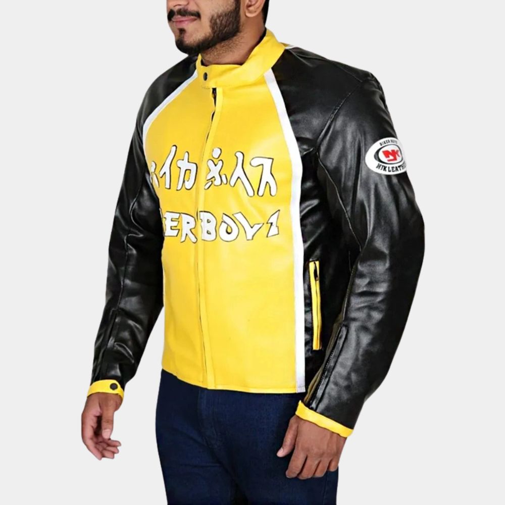 Crafted from high-quality leather, this jacket features a vibrant yellow color body accented with bold white & black elements. The jacket’s design includes a classic stand up collar, full sleeves adorned with sponsor logos, and a prominent Biker Boyz logo on the back, emphasizing the character’s affiliation with his crew. Its practical features, such as side pockets and a durable front zipper closure, enhance its functionality for everyday wear.