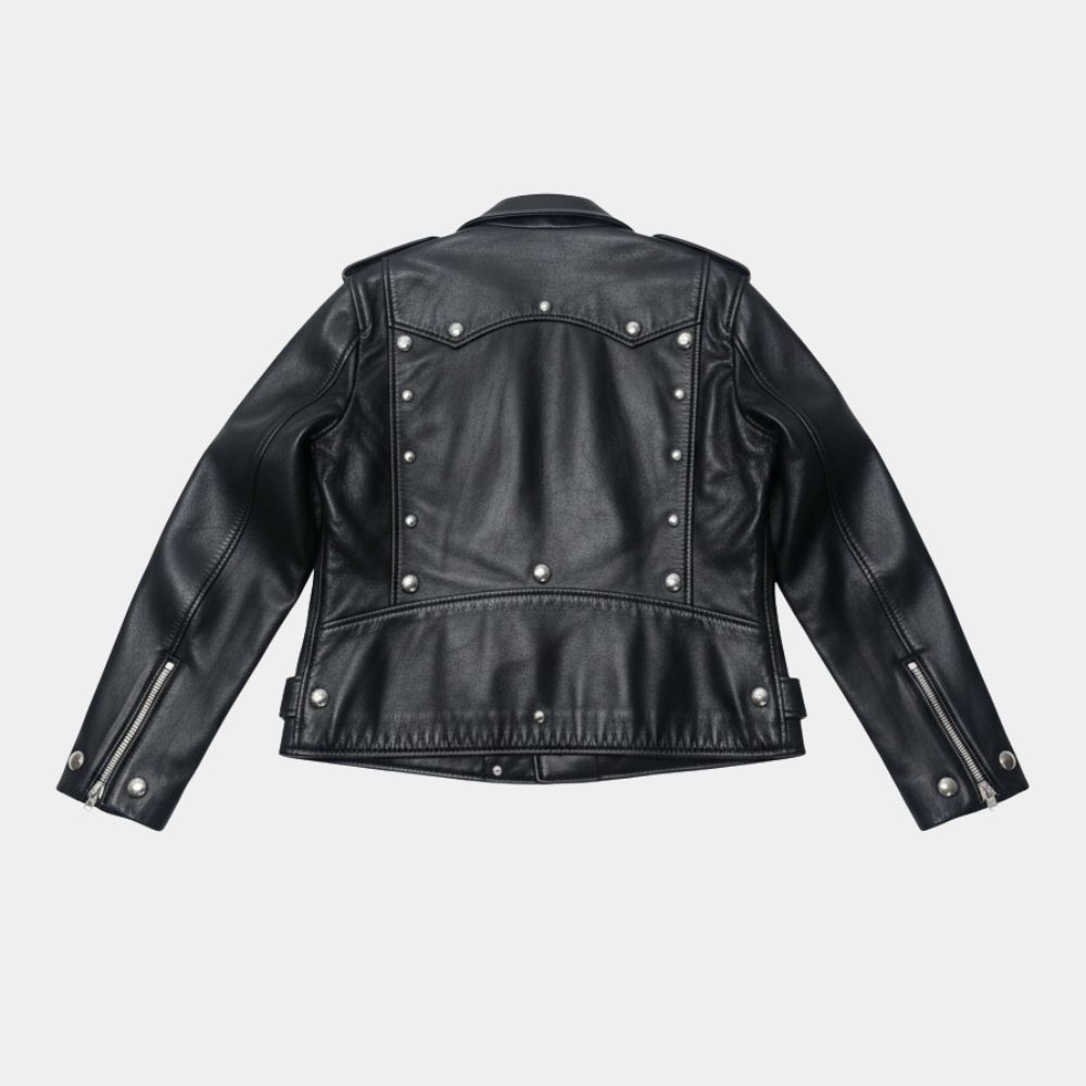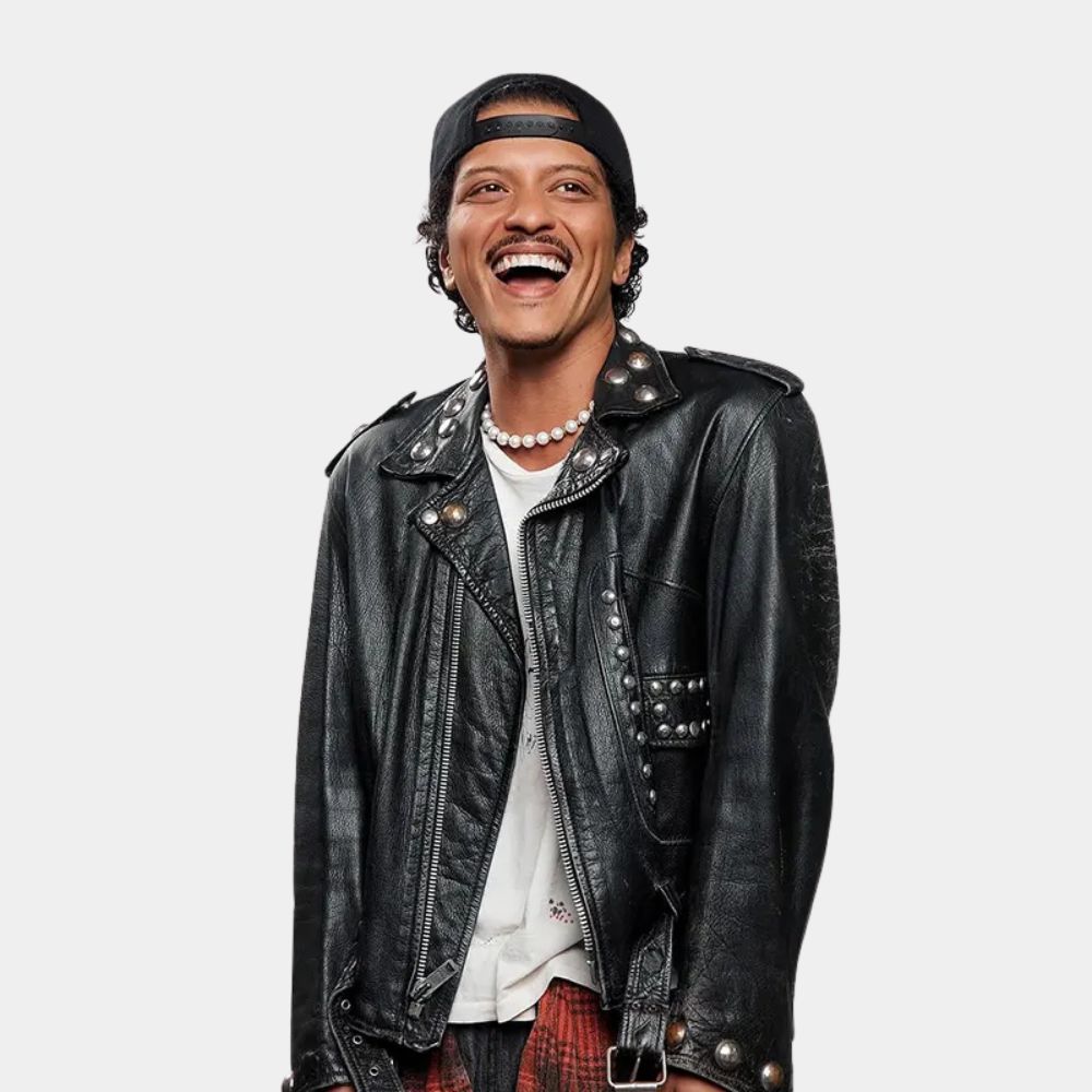 The asymmetrical zipper, multiple pockets, and fitted cut give it that authentic biker energy, while the studded embellishments add a touch of luxury and rebellion. Originating from motorcycle culture, the biker jacket has always symbolized freedom and individuality, which aligns perfectly with Bruno’s effortless confidence and creative flair. The jacket itself is a masterclass in standout design. Crafted from black leather, it’s detailed with metal studs along the lapels and shoulders that catch the light in just the right way — perfect for a performer who lives for the spotlight.