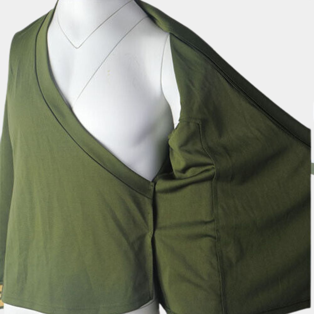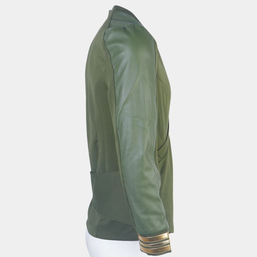 Design wise, the green tunic carries a sleek, structured cut with sharp shoulders and clean detailing that gives it a futuristic edge. The use of gold trim and Starfleet insignia adds authenticity while grounding it in the franchise’s uniform design language. It draws from the original series aesthetics, particularly Captain Kirk’s iconic wrap tunic, but gives it a refined, updated finish to suit the show’s modern look. Its significance lies in how it bridges nostalgia with innovation, appealing to long time fans and new viewers alike. For those wanting to wear it, the tunic is a perfect fit for cosplay, conventions, themed gatherings, or even as a collector’s piece that celebrates one of Star Trek’s most charismatic captains.
