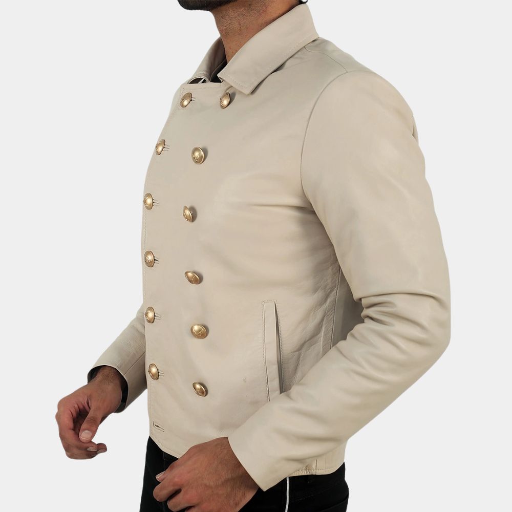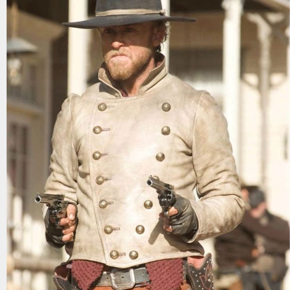 The jacket itself draws from frontier fashion of the late 1800s, where leather was both practical and long lasting, but it carries a refined edge with its tailored fit and button down front. Its beige tone makes it stand out against the darker coats and vests of the era, marking Prince as someone who refuses to blend into the background. The minimal detailing keeps it sleek, while the structured design gives it authority. Jackets like this symbolize status and individuality in Western storytelling, which is why it perfectly underlines Charlie Prince’s place in Wade’s gang. For fans, it’s an ideal choice for Western themed events, cosplay, or even as a bold outerwear piece that channels old frontier grit with a hint of outlaw charm.