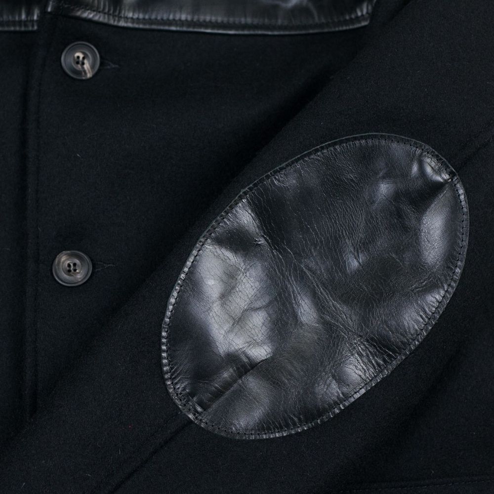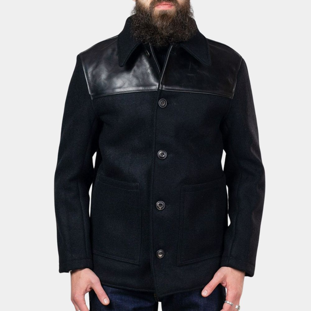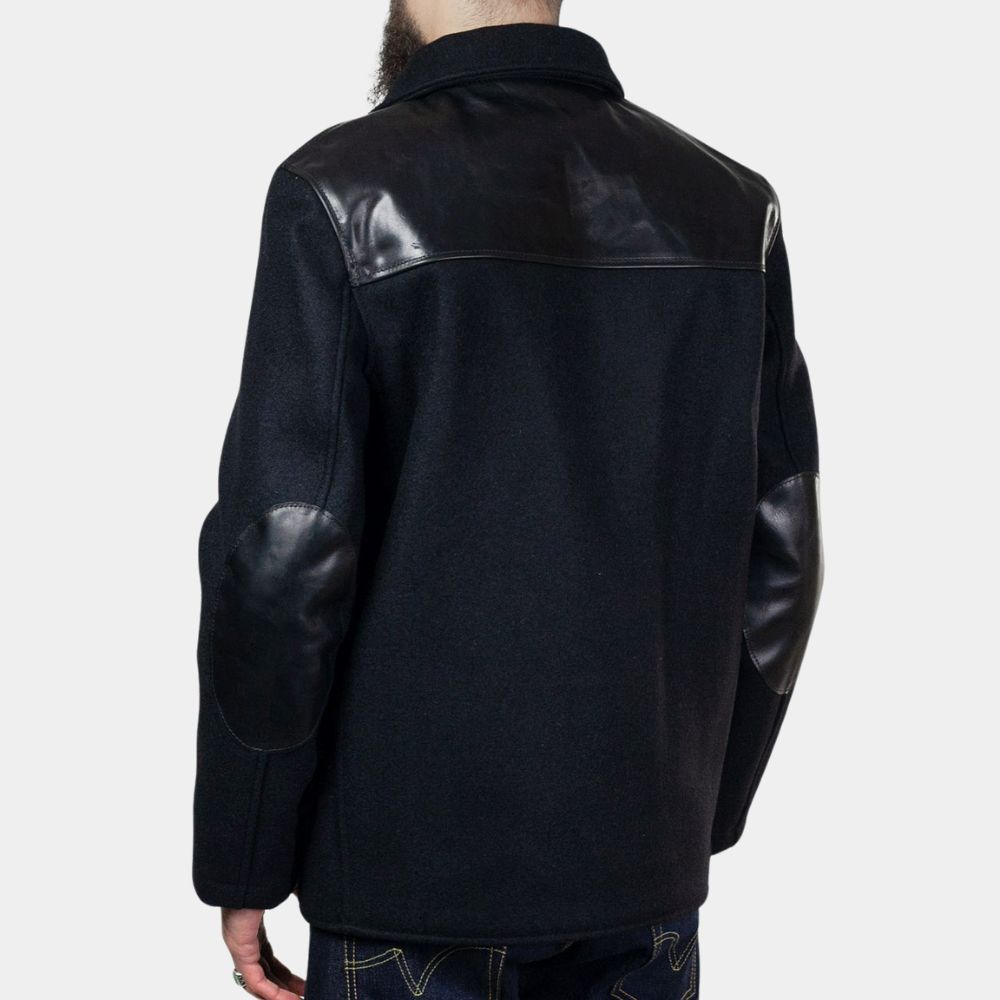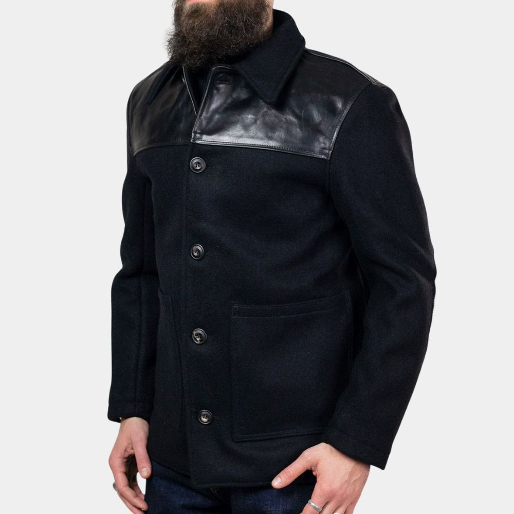 Crafted from high-quality black wool, the jacket not only provides a sophisticated and sleek appearance but also ensures warmth and comfort. The design draws from timeless menswear aesthetics, showcasing a nod to traditional craftsmanship and elegance. The addition of real leather shoulders brings a modern edge to the jacket, infusing it with a touch of ruggedness and urban flair.