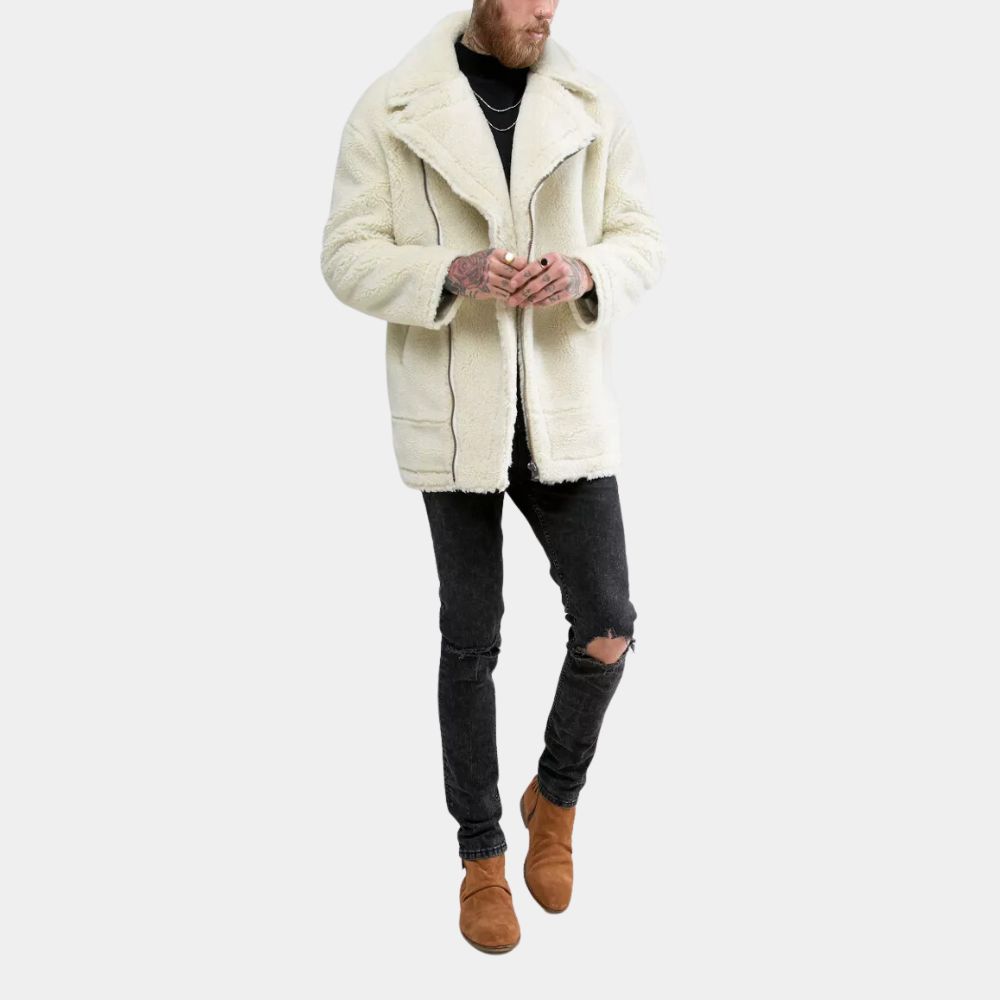 Jonah White Shearling Jacket is a striking fashion statement. Boasting a full shearling lining, it provides unparalleled warmth and comfort. Its standout feature is the broad-notch lapel collars, making it a fashionable and comfortable choice for chilly days.