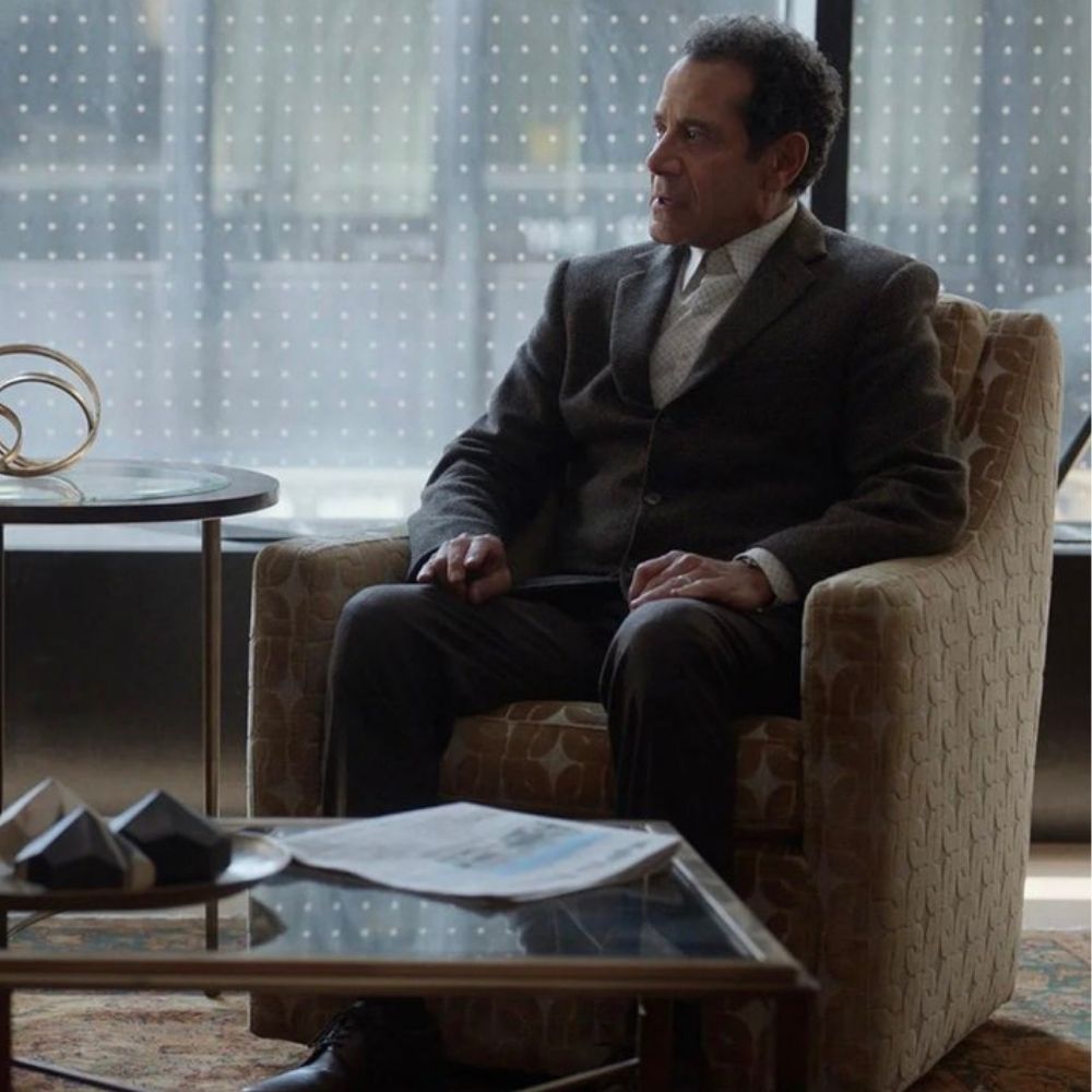 In “Mr. Monk’s Last Case,” Tony Shalhoub’s character, Adrian Monk, wears a distinctive Wool blend Jacket that leaves a lasting impression. This brown wool three-button blazer exudes timeless elegance and sophistication. The wool blend fabric adds depth and texture to the jacket, giving it a classic, rustic charm.
