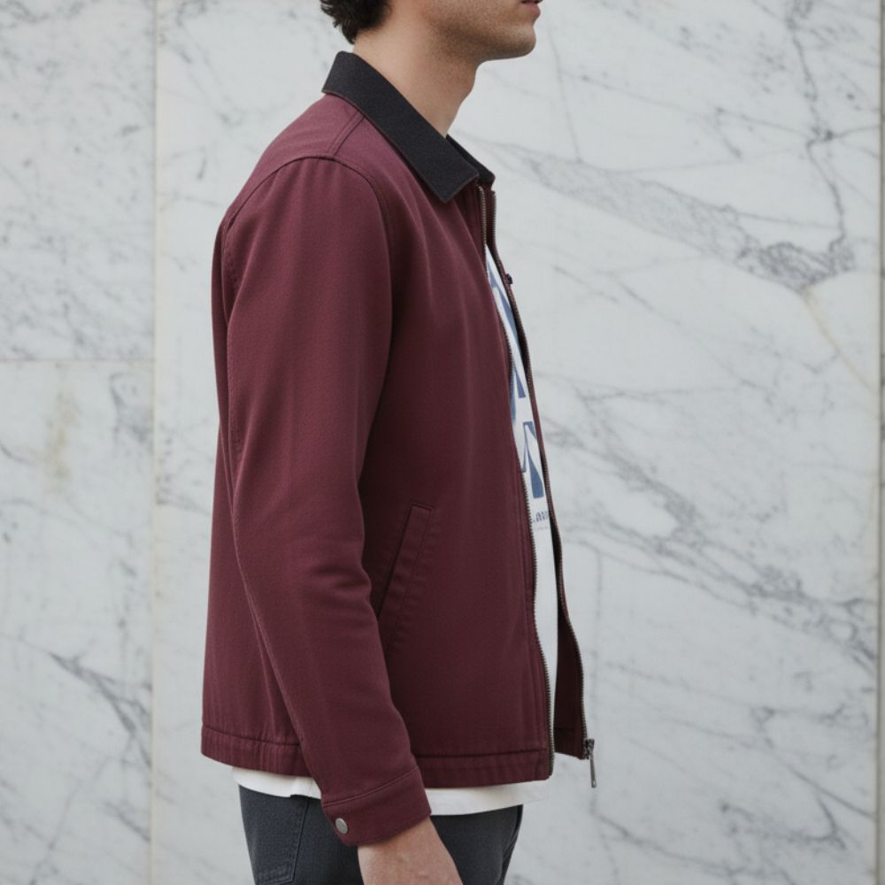 It features clean lines, a zip front, and tailored seams that give it a modern, understated edge. The maroon tone reflects a sense of individuality and quiet power, setting it apart from typical neutral outerwear. Jackets like this trace their roots to classic varsity and bomber styles—symbols of youth and charisma—which fits Bosco’s fresh yet commanding vibe.