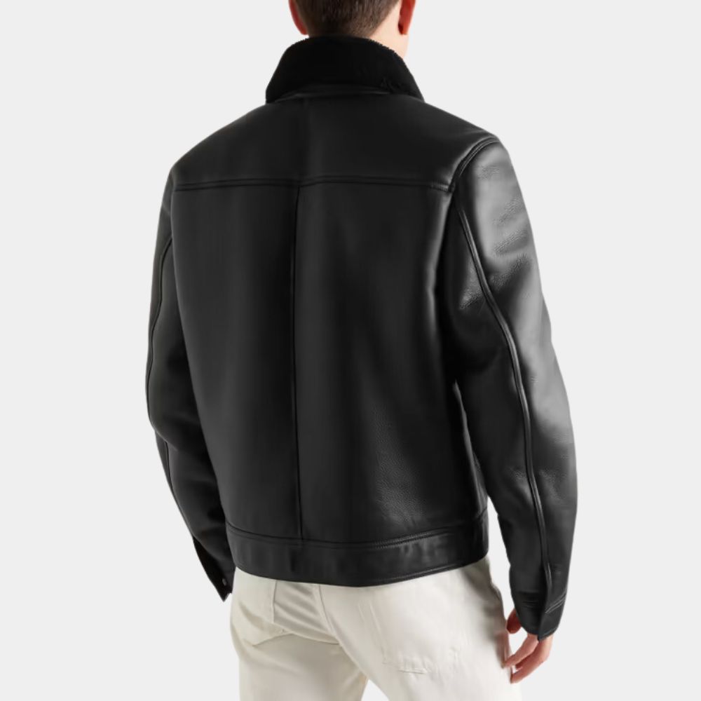 Men’s Shearling Collar Black Leather Trucker Jacket