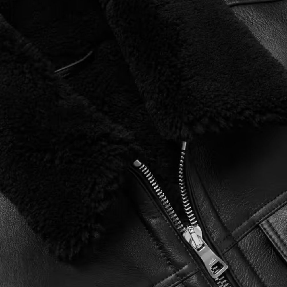 When you slide into this jacket, you get a clean and straightforward look with a strong personality. The black leather offers a sleek, versatile base that pairs effortlessly with everything, while the fluffy shearling collar adds a touch of texture and comfort. Its sturdy yet soft feel makes it perfect for cool weather, whether you’re heading out for a casual day in the city or a weekend getaway. Functional details like snap buttons, chest pockets, and adjustable cuffs give it just enough edge while keeping things practical. It’s the kind of jacket you can rely on season after season, making it a solid investment in both style and utility.