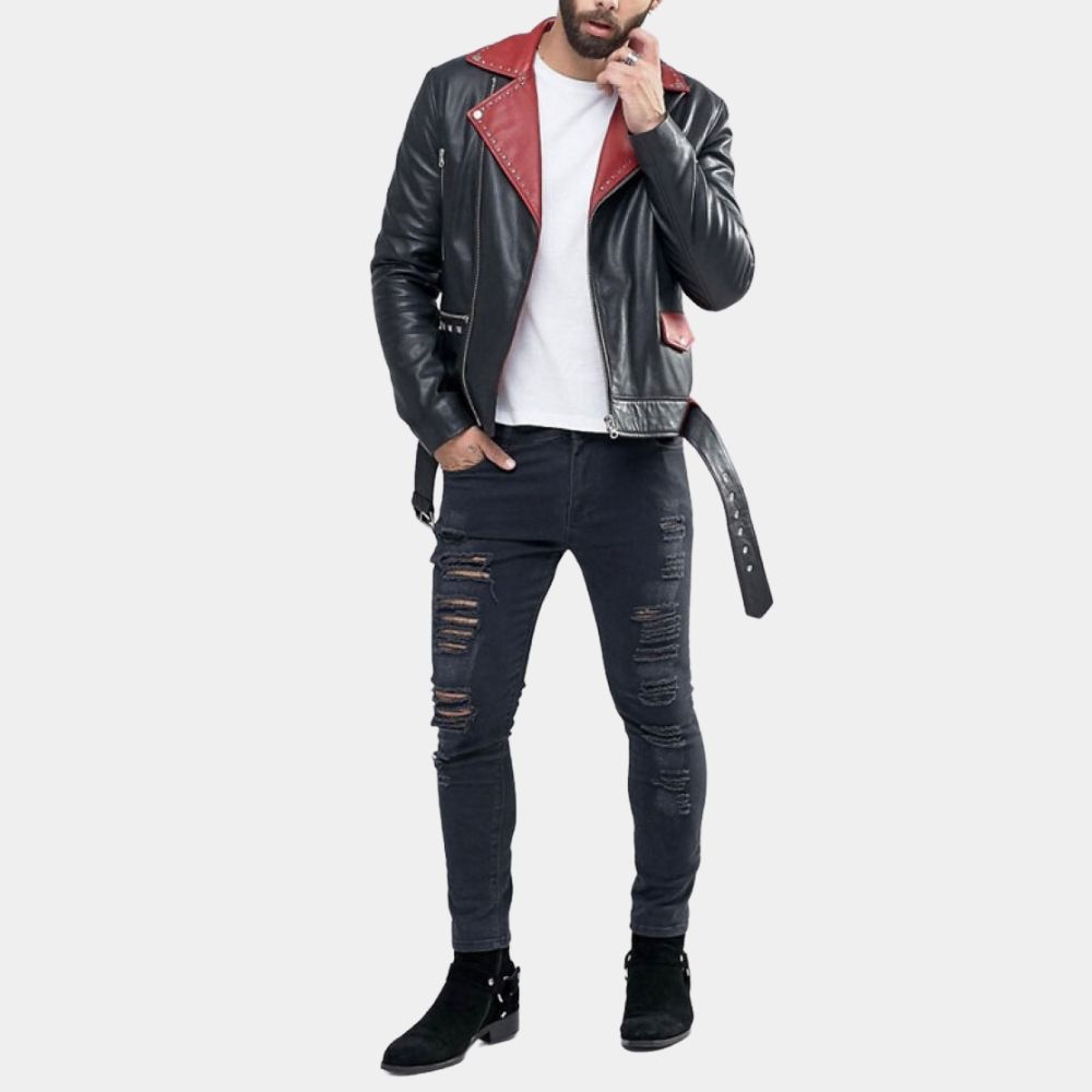 Red Studded Lapels Biker Jacket