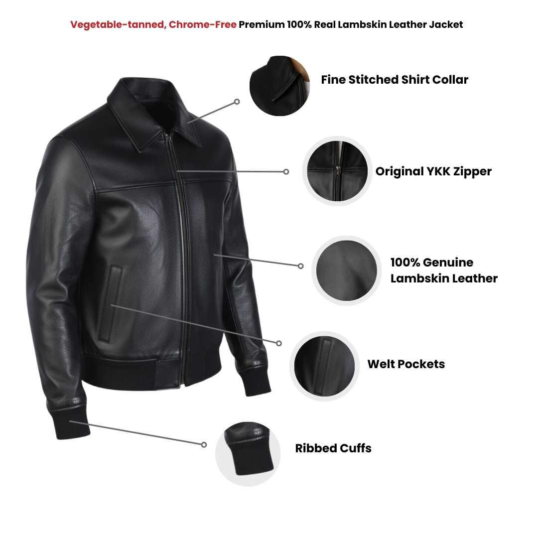 The design of this black leather bomber jacket strikes a perfect balance between classic charm and modern touches, making it visually appealing without being over the top. The shirt collar is a standout feature that elevates the jacket’s look beyond the usual bomber style, offering a clean and structured neckline. This subtle design choice gives the jacket a smart-casual vibe, so it works just as well with a crisp shirt as it does with a basic tee. The ribbed knit cuffs and waist add texture and functional flair, providing a regular fit that traps warmth while giving the shirt collar leather jacket its iconic bomber shape. These details prevent the jacket from looking boxy or shapeless, enhancing its tailored feel and flattering various body types. Pockets are placed thoughtfully—not just for convenience but also as design elements that break up the leather surface, adding dimension and interest. The combination of outer and inner pockets maintains sleek lines without clutter, blending practicality with style seamlessly. The genuine sheep leather itself contributes a rich, natural look with subtle grain and softness, capturing light differently throughout the day to create depth and uniqueness in the jacket’s appearance. Over time, this leather develops a slight patina, making each jacket truly one of a kind.