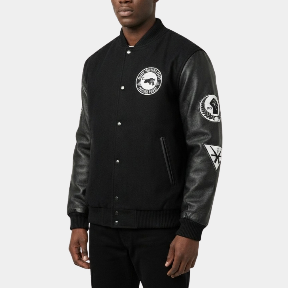 The design aesthetics of this Black Panther Party 1966 Black Varsity Jacket nail a bold mix of athletic varsity roots and militant edge. The all-black base creates a unified strong presence drawing from the Panthers uniform tradition while the real leather sleeves add a premium tactile weight that feels substantial and ready for real-world wear.