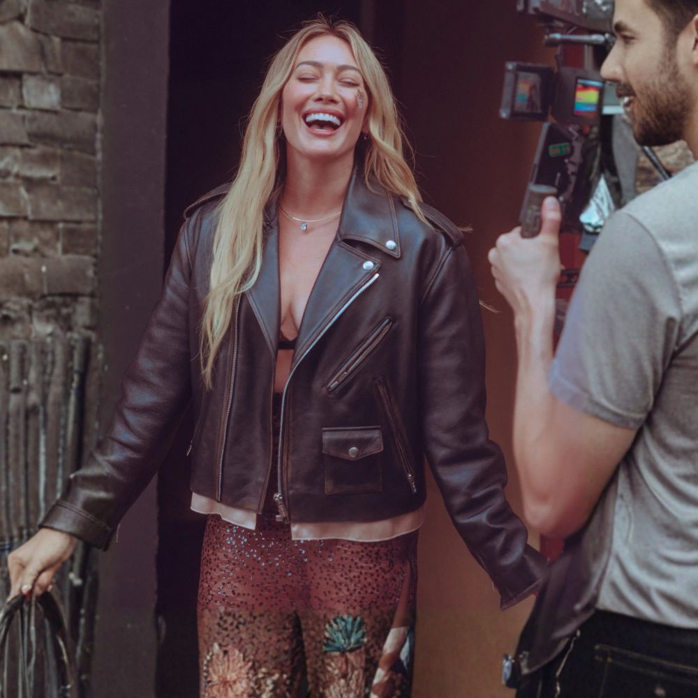 Hilary Duff has always had that grown up cool girl energy in her more recent roles and the mature black biker leather jacket fits right into that vibe. It pulls inspiration from the kind of confident next chapter version of herself that her characters often step into especially when they are balancing work love and personal evolution. The biker style taps into a classic rebellious spirit but in a way that feels steady and self assured rather than wild which mirrors the way her characters tend to reclaim their voice. This jacket feels like a nod to the history of biker culture where outerwear was about independence and motion and that makes total sense for a character who is learning to move forward again.