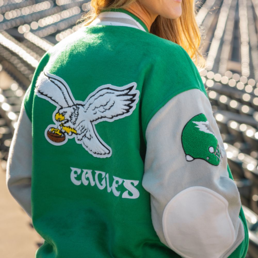 The design follows the classic varsity jacket formula with a wool body in team green, complemented by grey leather sleeves that give it structure and durability. Bold Eagles branding on the chest and back makes it unmistakably tied to the team, while striped ribbed cuffs, collar, and hem add to its sporty edge. The style itself has roots in American college and sports culture, a look that symbolizes community and team spirit, which is what made Diana wearing it so impactful. For fans, this jacket works not just for game days or sporting events but also as a nostalgic fashion piece that bridges casual wear with a touch of history, letting you carry a little piece of Diana’s legacy into your everyday wardrobe.