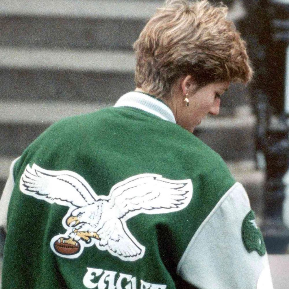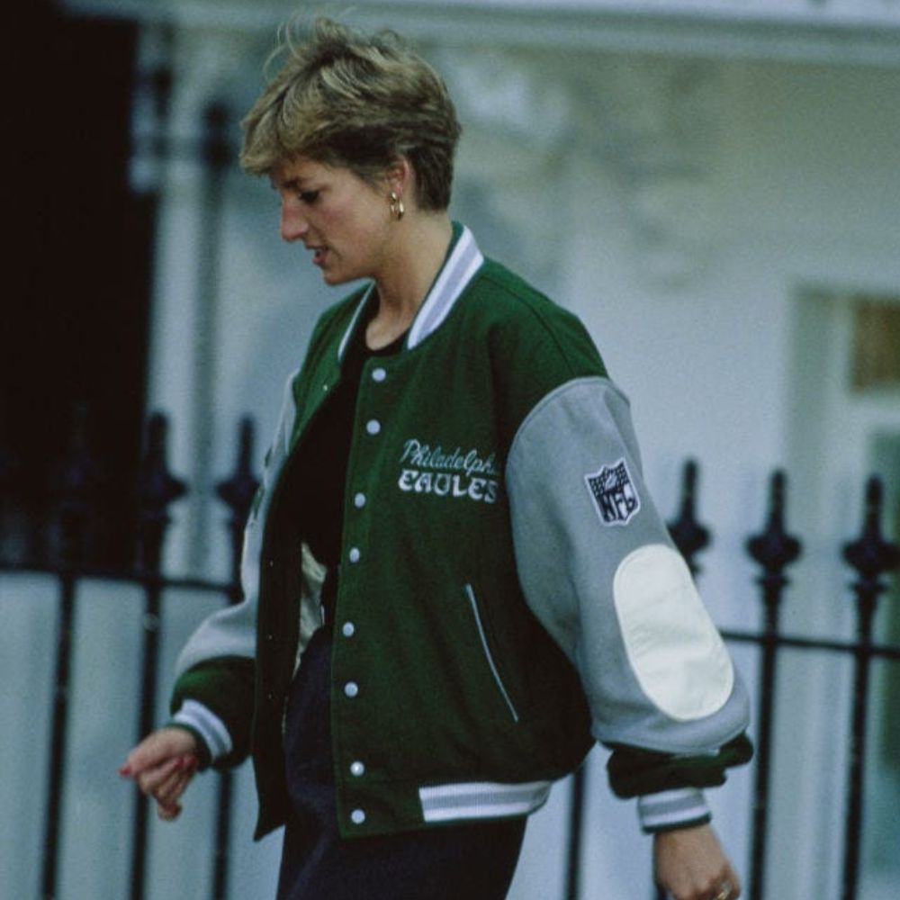 Princess Diana’s Philadelphia Eagles varsity jacket is one of those fashion moments that perfectly captured her effortless ability to blend royalty with everyday style. The jacket, in green and grey, became an iconic look because it showed a more relaxed and relatable side of her, away from gowns and tiaras. Diana was known for breaking royal traditions and connecting with people in her own authentic way, and wearing a sports varsity jacket was a simple yet powerful statement of that. It reflected her playful personality and her openness to embrace casual culture, making the piece timeless in how it connected her to fans on a more personal level.