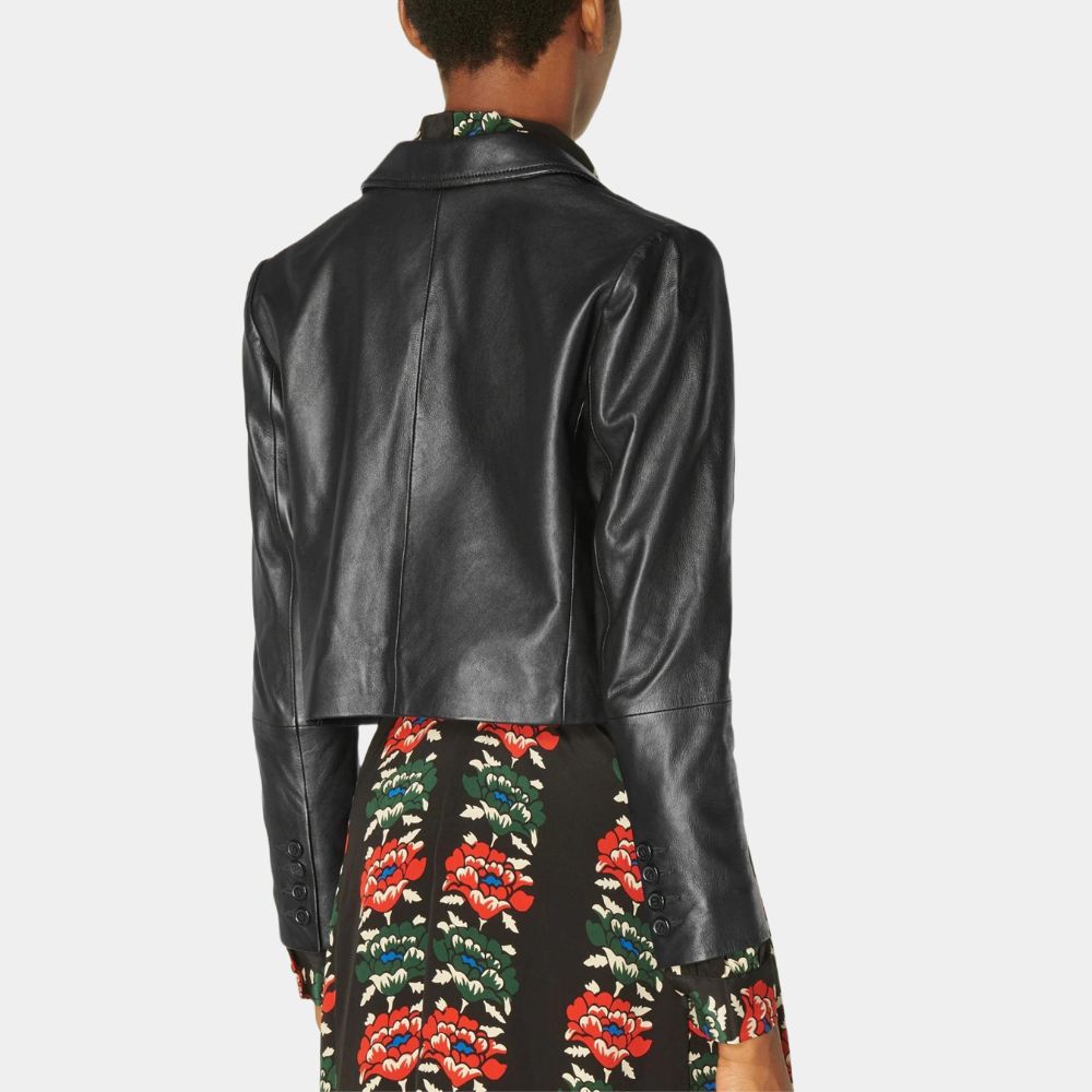 The cropped leather jacket in black gives a warm appeal as well as fits the modern fashion needs. Full-lenght sleeves have buttoned cuffs and four square-shaped patch pockets are the minimal looking detail that uplifts the style game and creates the unmatchable classy yet sophisticated persona.