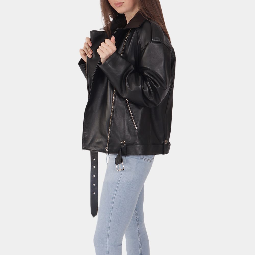 This minimalist leather biker jacket in black is stitched to perfection for easy wear and spontaneous style. Long butterfly collars with a waist belt and silver hardware add the chic factor while epaulets are designed to give the final nail to the perfect biker look.