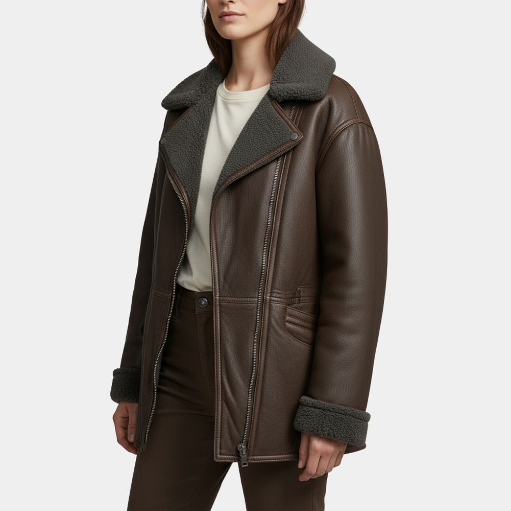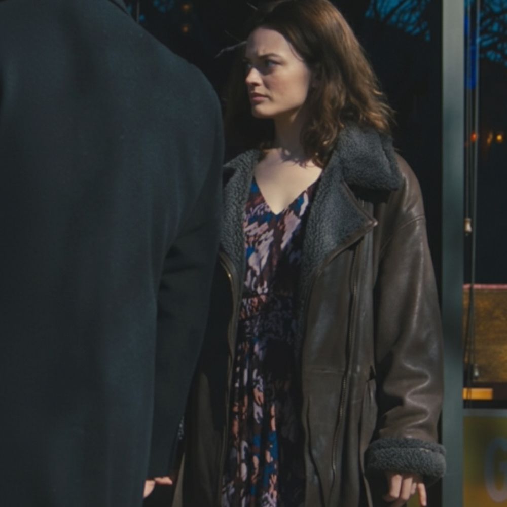 Emma Mackey’s tan shearling leather jacket in Ella McCay feels like it was built straight out of her character’s world. The film paints her as someone sharp but grounded, navigating pressure-heavy moments with a mix of calm and grit. This jacket fits that energy perfectly. It channels classic Americana outerwear often linked to travel, independence, and small town resilience, which mirrors the movie’s themes. It has that warm, lived-in vibe that says the character has history, stories, and a habit of stepping into the unknown with quiet confidence.