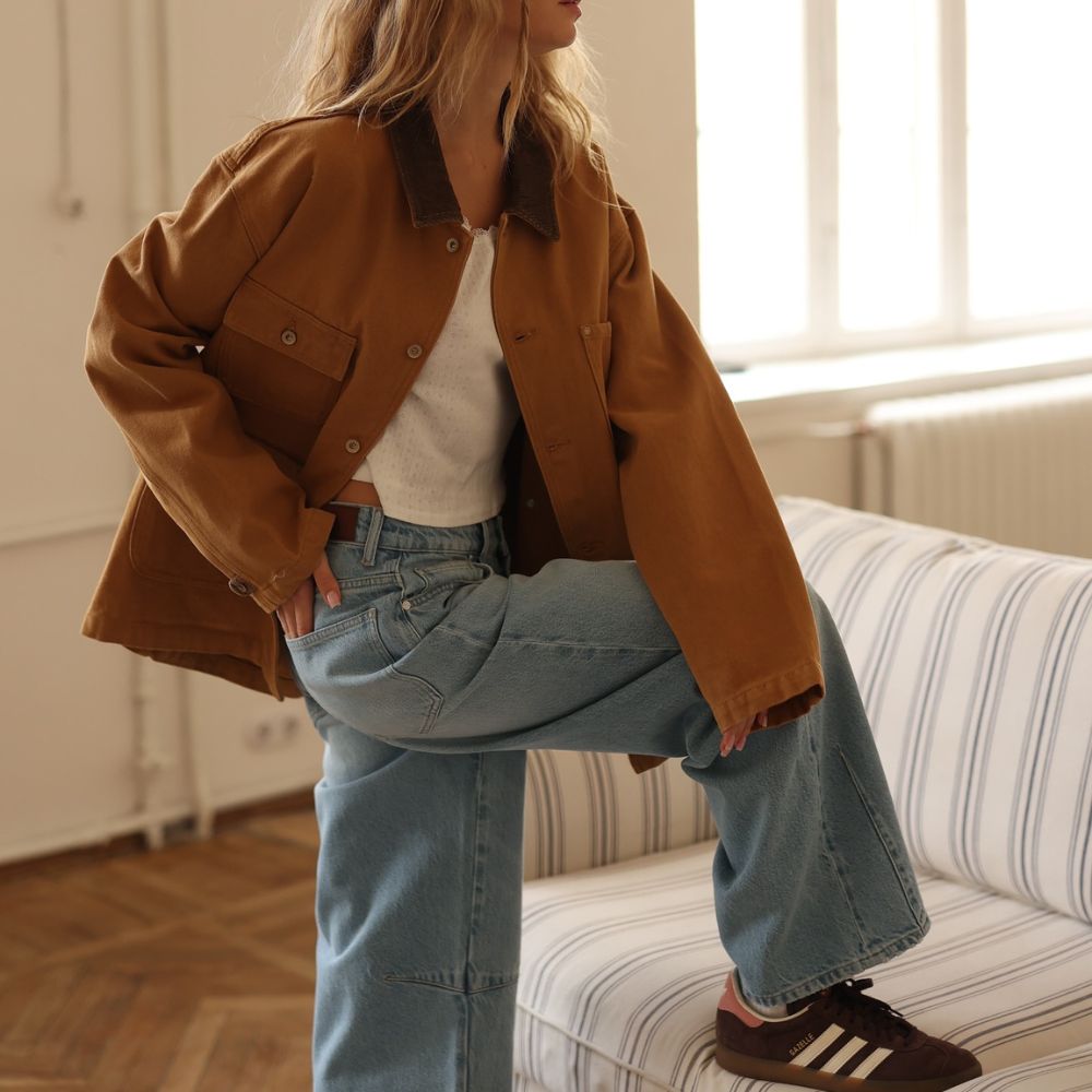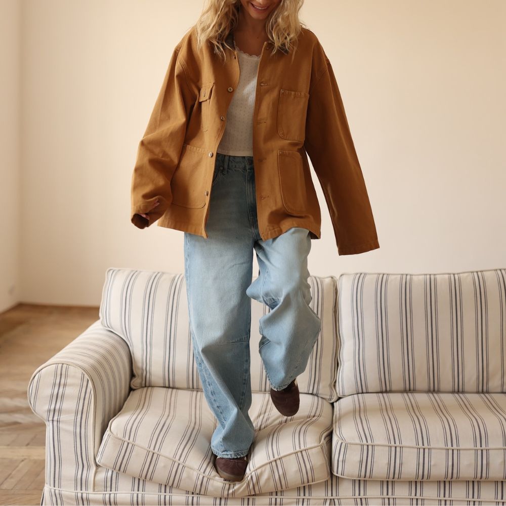 The jacket leans into soft tan cotton with a clean front and simple lines that make it effortless to wear. It has a relaxed shape that layers well and gives that ready for anything feel without trying too hard. Details like the cozy inner lining and easy to handle buttons keep it functional while still giving it a warm seasonal vibe. The design nods to old school winter staples that were all about comfort and dependability and that gives the jacket its charm.