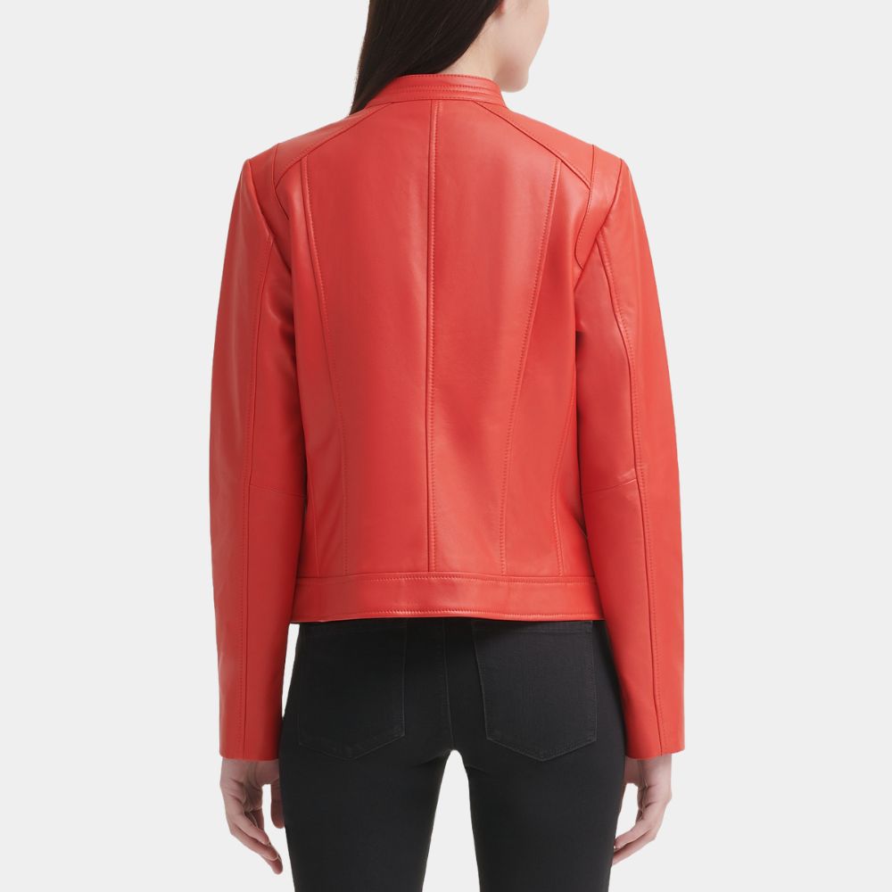 The stylish women’s leather jacket is stitched to a body fit, enhancing the perfect upright silhouette. The sleek wear with a snap tab collar button completes any ensemble with elegance and class. The figure-flattering outerwear is tailored using buttery soft leather for maximum comfort.