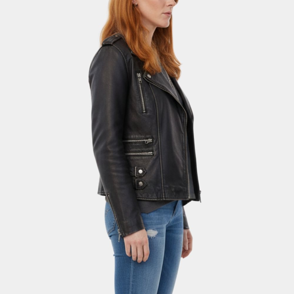 Rosalie Craig Black Leather Biker Jacket | Kitty Eckersley Leather Jacket