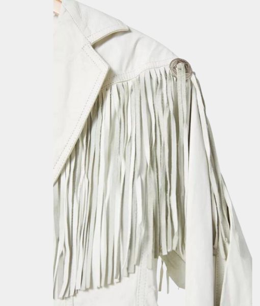 Ordinary Angels Sharon White Jacket features exquisite fringes that add a touch of elegance and movement to your outfit. For a flair look, sleeves are adorned with laced ties. Asymmetric snap fastening make it look more trendy. Designed like an 80’s Vintage Western Leather Jacket, the white colour is versatile, making it perfect for any occasion.