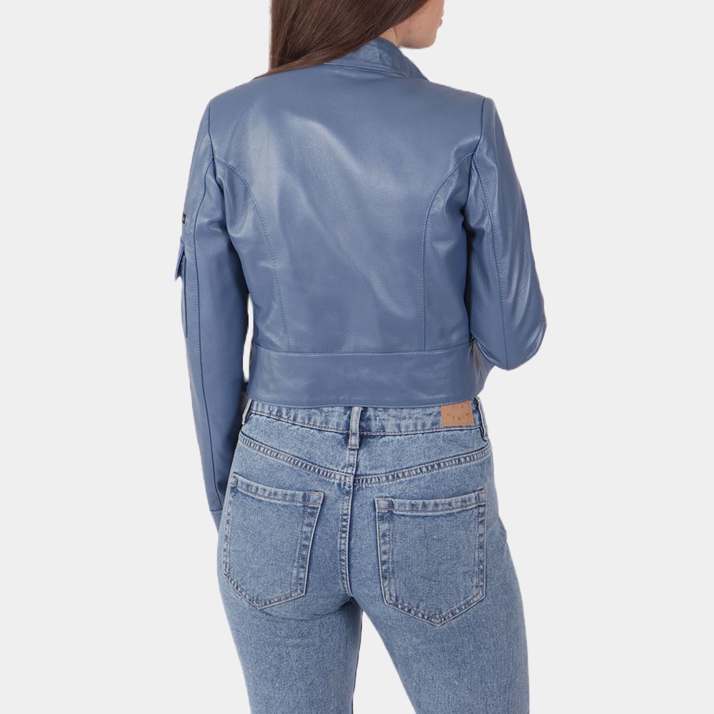 Blue Leather Cropped Biker Jacket