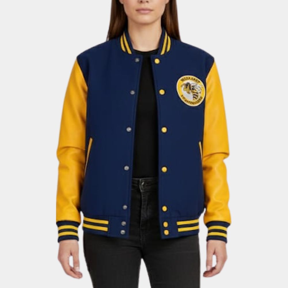 Crafted from a blue wool blend with vegan aka faux leather sleeves and leather pocket trim. It visually evokes the classic letterman jacket of a high school soccer team but with a different DNA of Popular Series, weathered look befitting the harsh wilderness conditions the Yellowjackets characters endure. The yellowjackets varsity jacket’s embroidered Yellowjackets Wiskayok left chest Logo  patch and subtle details, such as the quilted sateen lining and custom cuffs, add authenticity and depth for hardcore fans who appreciate the blend of style and narrative significance.