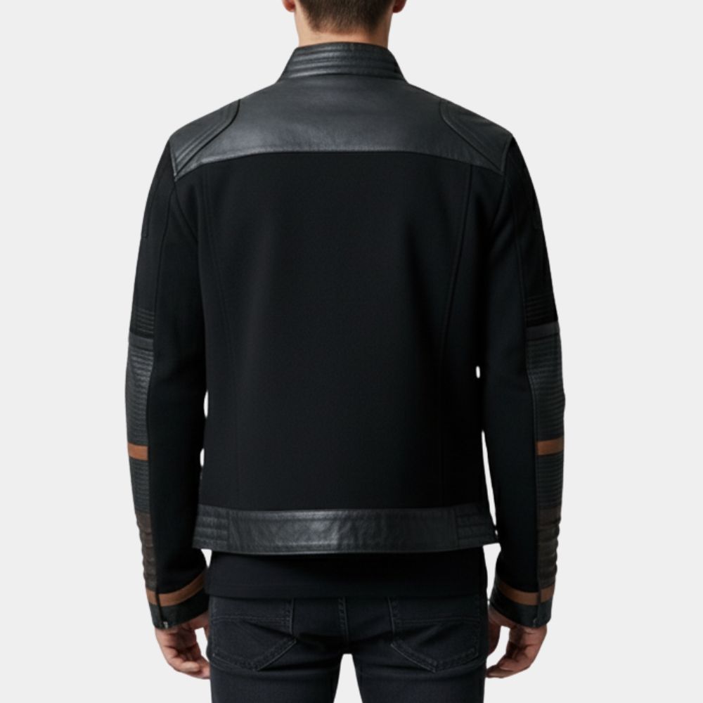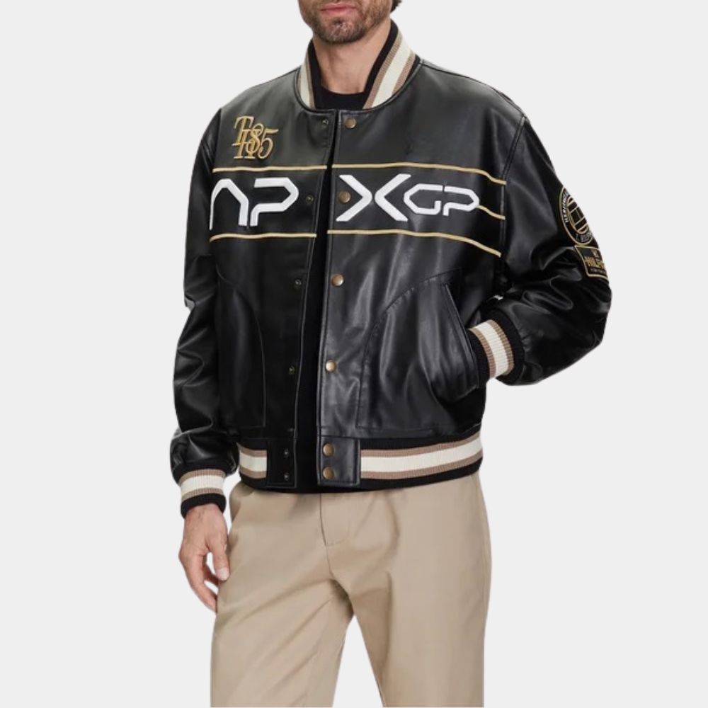 Worn by Idris both on screen and in promotional campaigns, the jacket is crafted from black vegan leather, emphasizing a modern approach to luxury outerwear. Its design features sharp tailoring and racing-inspired details like ribbed collar and cuffs that reflect the adrenaline and precision of Formula 1, making it not only a fashion statement but also a symbol of the high-octane energy that defines the film and the F1 sport. The varsity silhouette is enhanced by subtle branding elements from the fictional APXGP racing team, linking the wearer directly to the movie’s narrative and the racing world’s aesthetics.